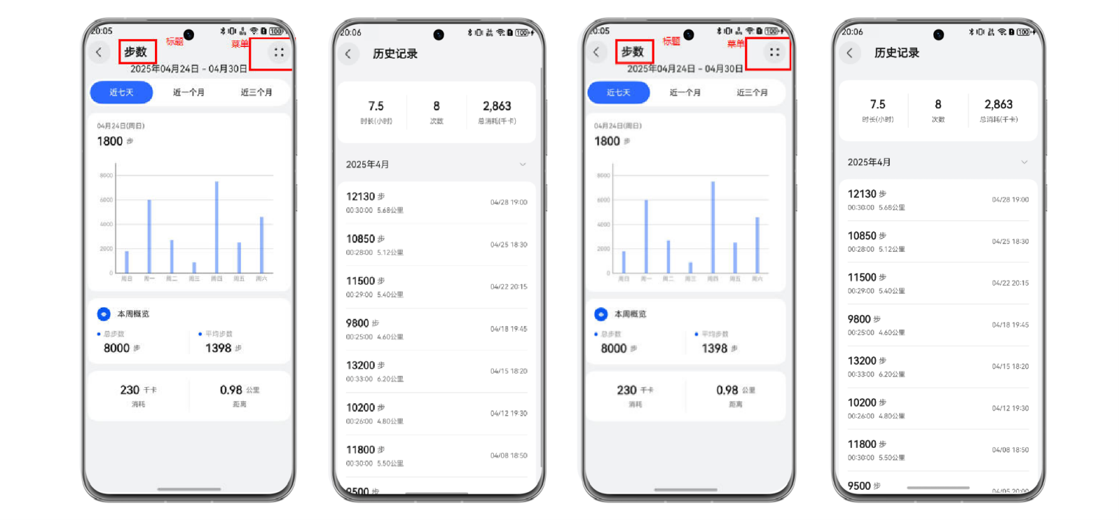本组件提供了健康数据可视化能力,用于展示步数、心率、血压、血糖、睡眠等健康数据。提供 6 种专业健康图表组件,基于 @ohos/mpchart 图表库实现,支持日/周/月视图切换,展示步数趋势和统计数据,按月份分组展示历史步数记录,自动计算平均值、最大值、最小值等统计指标,智能分析数据趋势。