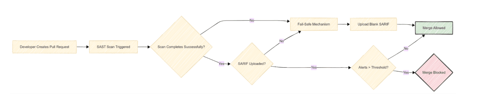 强制机制通过GitHub仓库规则集(repository rulesets)来实现,也就是阻塞 Pull Request 合并,直到静态分析完成且漏洞处于可接受的风险阈值内。为避免扫描器故障或基础设施异常中断开发者流程,LinkedIn 构建了多重安全机制,包括紧急停止开关(kill switches)与自动降级策略。在故障场景下,系统会注入空 SARIF 报告以解除阻塞的合并请求,同时仍会采集遥测数据用于事后分析。