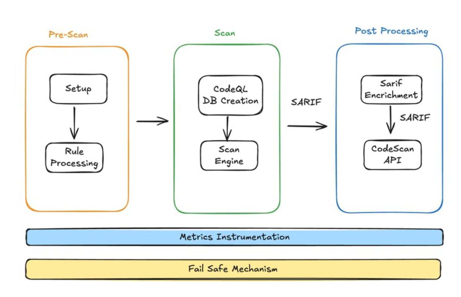 新架构基于GitHub Actions进行编排,并整合了两款核心扫描引擎CodeQL与Semgrep,选择它们是因为二者覆盖范围互补且易于扩展。LinkedIn 工程师实现了自定义工作流,用于管理规则执行、编排扫描流程并处理扫描结果。所有漏洞发现结果均基于SARIF标准进行规范化,并补充元数据,为开发者与安全团队提供清晰的修复指引与可落地的上下文信息。
