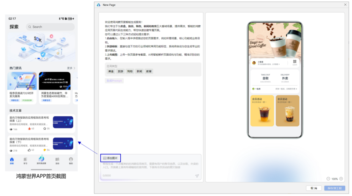 如何使用“图生代码”功能?以下我们以生成“鸿蒙世界 APP 首页”为例,演示从截图生成鸿蒙页面代码的完整流程: