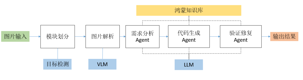 针对以上挑战,我们在鸿蒙场景下探索了多种生成方式,考虑到当前 VLM/LLM 在端到端图片到代码生成中的可用性仍较低,我们最终选择了“先解析、后生成”的架构方案。首先基于 VLM 与目标检测模型实现高精度视觉解析,达到 85%以上的元素解析准确率,然后基于鸿蒙知识库增强,构建需求分析、代码生成、验证修复三类 Agent 协同生成最终的 ArkTS 代码。目前可实现 2min 左右完成页面代码生成,可编译预览率接近 100%,自 Beta 试用以来线上采纳率约 40%。