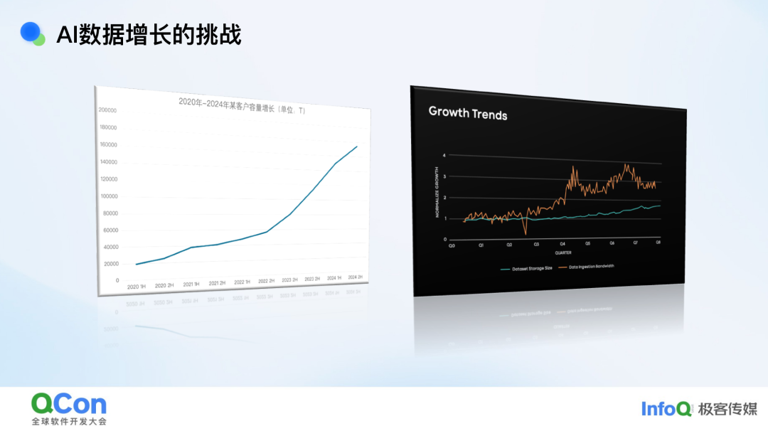 大模型时代的存储面临着诸多挑战。从下图可以看出,黑色图是去年 Meta 公布的数据,其中绿色线代表过去两年其容量的增长情况,橙色线则表示性能的增长情况。在过去两年里,尽管 Meta 的数据量基数已经很大,但其容量仍翻了一番。而橙色线所显示的吞吐情况,相比之前已接近原来的四倍。白色图展示的是我们一个大客户的存储情况,仅代表他在我们 YRCloudFile 中的存储数据量。我们统计了他这四年里的数据增长情况,发现在 2020 年到 2022 年之间,每年数据量增长接近 20T。但从 2022 年年底开始,到 2024 年年底,其数据量增长愈发迅猛,基本以每年 60T 的速度增长。这一增长情况与大模型时代到来的时间点相契合,即 2022 年下半年,尤其是年底 ChatGPT 爆发时,国内的大模型厂商纷纷跟进,数据量也随之飞速增长,这便是数据增长方面所面临的挑战。