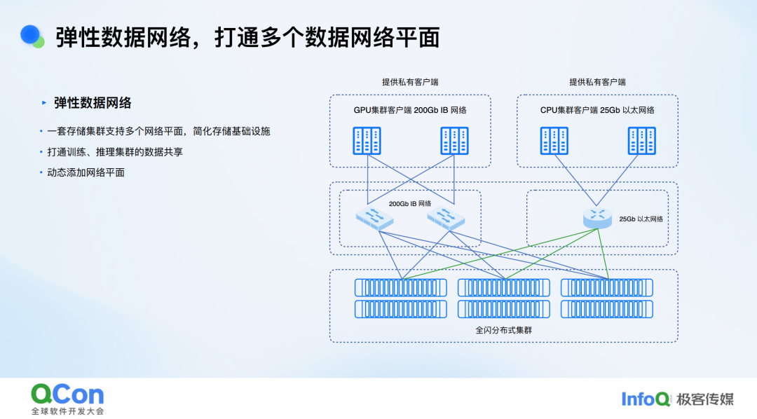弹性数据网络的本质是帮助用户打通多个网络平面,同时访问一套存储。在 AI 领域,这种需求非常常见。例如,训练集群和推理集群对网络的要求不同,训练集群通常需要 200Gb、400Gb 的 IB 或 RoCE 高速无损网络,而推理集群则一般使用 25Gb 或 100Gb 的以太网网络。这两种网络在物理层面上是隔离的,如果想要实现数据共享,要么通过存储系统本身支持多任务、多网络平面的访问,要么就需要进行额外的数据同步操作,这无疑增加了系统的复杂度。有了弹性数据网络,就可以简化存储基础设施,提高系统的灵活性和效率。