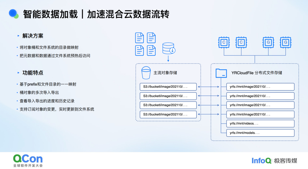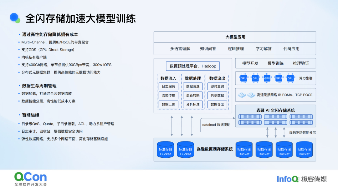 在 AI 训练阶段,性能是至关重要的。我们通过多种技术手段来提升性能,包括 Multi-Channel 技术、支持 GPU Direct Storage 以降低延迟、内核私有客户端以及支持 400Gb 的 Infiniband 或 RoCE 无损网络。此外,我们还提供了分布式元数据集群来进一步增强性能表现。在数据生命周期管理方面,我们实现了分层存储和数据加载功能,这不仅有助于降低成本,还能打通混合云环境中的数据流转。而在运维方面,我们提供了一系列功能,如 QoS、Quota、子目录挂载、ACL、审计、回收站以及弹性数据网络等,以确保整个大模型训练过程的稳定性和高效性。在智算中心的整体存储架构中,对象存储作为数据底座,而 YRCloudFile 则作为训练存储的加速层,为训练阶段提供高效支持。