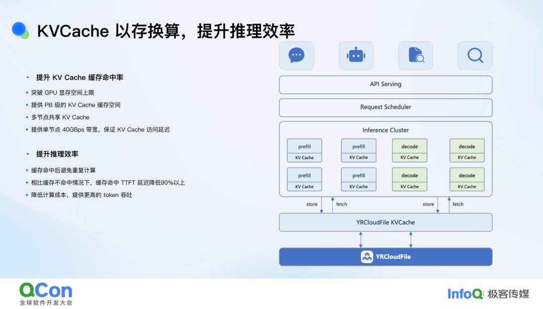在推理阶段,我们的解决方案主要围绕提升推理效率展开。我们针对 KVCache 进行了优化,通过以存换算的方式提高推理效率。我们提供了一个 PB 级的 KVCache 缓存空间,这有助于提高 Cache 命中率,从而节省算力。由于 KVCache 本身是一个吞吐且延迟敏感型的应用,我们确保单个计算节点能够提供 40GBps 的带宽能力,并保证了 KVCache 访问的低延迟。