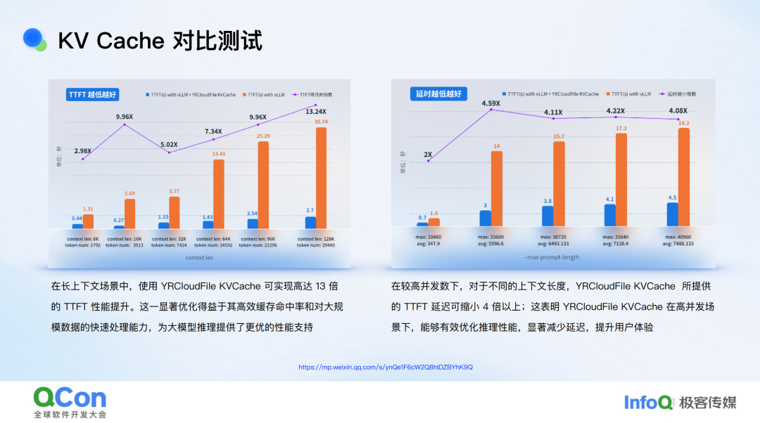 在测试数据方面,我们在两种场景下进行了性能对比。第一种场景是在长上下文情况下,使用 KVCache 后,TTFT 延迟显著下降,性能提升了约 13 倍。第二种场景是在高并发情况下,针对不同上下文长度的对比测试。我们将使用 vLLM 原生方案与加入 YRCloudFile 后的数据进行对比,结果显示,当上下文长度越长时,使用 KVCache 的效果越好。