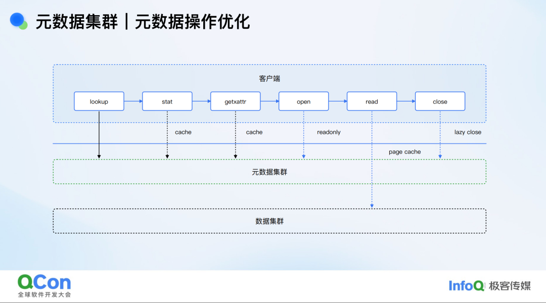 除了架构层面,文件系统还有很多细节需要注意,其中包括缓存等。在访问小文件时,主要涉及的元数据操作包括 lookup、getattr 获取元数据、getxattr 获取扩展属性、open 打开文件、读取和 close 关闭文件。对于小文件而言,真正读取数据的 RPC 只有一次,其余的都是元数据操作。因此,在小文件场景中,元数据的重要性不言而喻。针对 AI 场景,我们进行了许多优化。首先,我们有元数据缓存,它可以省去 getattr 或 getxattr 等 RPC 操作。其次,在训练过程中,读取文件时通常是只读的,我们可以将 POSIX 语义弱化。因为在文件系统中,open 操作本身是一个很重的写操作,我们可以将其变为一个轻量级的读操作,从而实现 10 倍以上的性能提升。还有 close 操作,它也是一个很重的写操作,因为它需要更新元数据信息,如文件大小等。我们可以将 close 操作变为异步的,以进一步优化性能。