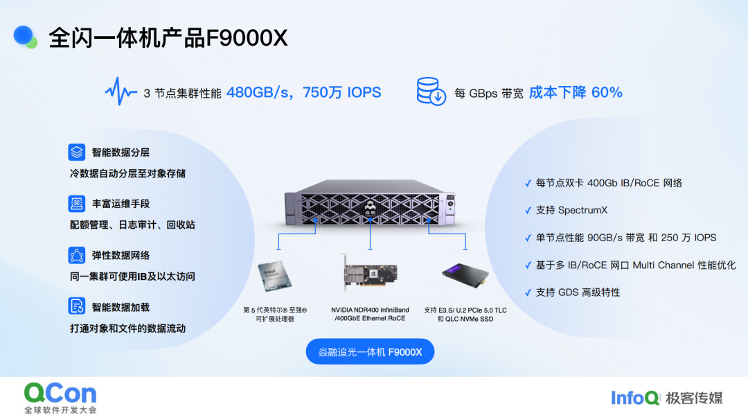 去年,我们发布了 F9000X 全闪一体机产品。该产品配备了第五代 Intel CPU 系列,4 张 400Gb 的 InfiniBand 网卡,以及 16 块全闪盘。需要注意的是,由于 CPU 插槽数量的限制,我们只能插入 16 块磁盘。这种配置下,一个三节点集群能够达到 480GB/s 的带宽和 750 万的 IOPS,相比上一代 F8000X 产品,每 GBps 带宽成本下降 60%。