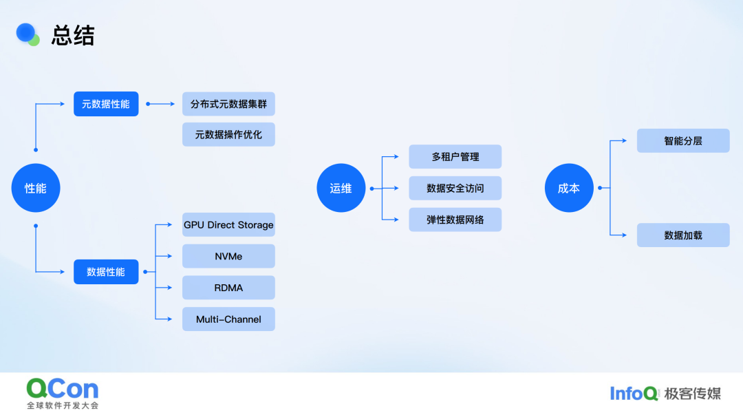 总结一下,我们在性能方面主要关注元数据性能和数据性能两大块。在元数据性能上,我们采用了分布式元数据架构,并针对元数据操作进行了优化。在数据性能层面,我们引入了 GPU Direct Storage、NVMe SSD、RDMA、Multi-Channel 以及 NUMA 亲和性等多项优化技术。