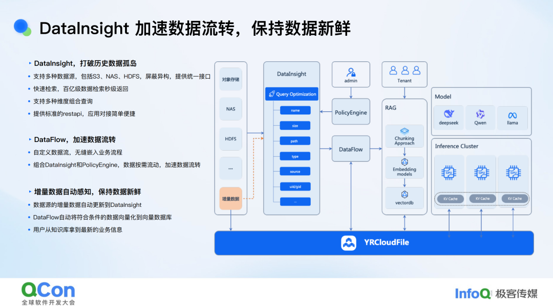 我们在推理场景中还提供 DataInsight 的解决方案。目前,DataInsight 主要应用于知识库平台,当前许多知识库平台在数据层面存在最后一公里的问题。DataInsight 能够帮助企业用户从海量历史数据中快速检索出有价值的数据。它支持多种数据源,包括 S3、NAS 或 HDFS 等,并能够实现百亿级数据的秒级检索返回。DataInsight 还支持多维度组合查询,使管理员能够精准检索所需数据,并通过 DataFlow 按需将数据流转到知识库平台中。同时,我们还实现了对第三方存储增量数据的感知功能,这对于企业来说非常有用,因为它能够确保知识库平台的信息保持更新,而无需侵入业务平台。当业务数据写入原有位置时,我们能够自动感知这些增量数据,并将其同步到向量数据库中,从而使知识库平台的用户能够及时获取最新信息,如产品发布参数和最新行业法规等。