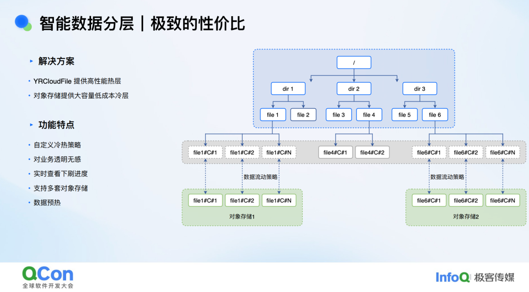 我们的设计理念是先确保性能达到要求,然后再通过各种手段降低成本。具体来说,我们采用了智能数据分层的策略。YRCloudFile 本身作为一个高性能的热层存储空间,主要用于存储频繁访问的热点数据。而对象存储则作为大容量、低成本的冷存储空间,用于存储不那么频繁访问的冷数据。对于业务应用来说,它们并不需要感知后端存储的具体实现,它们看到的仍然是一个统一的文件系统视图。
