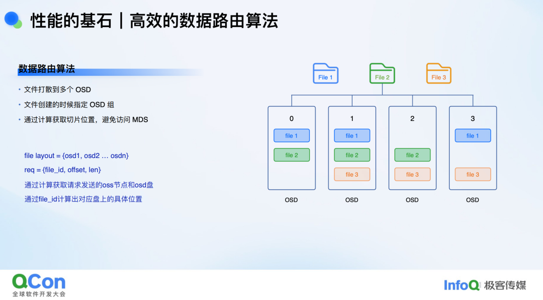 针对性能问题,我们深知 I/O 路径越简单,效率越高。因此,我们采用了一种非常简单的数据路由算法。在文件创建时,系统会划分一组 OSD(数据存储服务),确定文件将被打散并存储在哪些磁盘上。这一过程是静态的,在文件创建时就已固化。这种设计带来了两个显著优势。首先,在访问文件数据时,无需频繁访问元数据服务或数据服务,我们可以通过计算快速确定文件位于哪个磁盘的哪个位置。其次,由于文件被打散到多个磁盘上,能够充分利用这些磁盘的能力。在 AI 场景中,常常涉及大量计算节点同时访问某个大文件,因此大文件能够提供的带宽至关重要,这也是并行文件系统和分布式文件系统存在一些细微区别的原因之一。