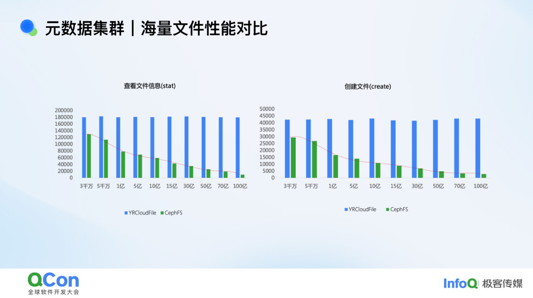 在项目早期,我们进行了一系列测试,主要针对不同数量的元数据服务(MDS)节点,如 1 个、2 个、3 个和 4 个节点时的性能表现。测试结果显示,性能增长基本呈线性趋势,这为我们后续的研发工作奠定了良好的基础。在实际应用中,当客户进行概念验证(POC)测试时,他们也会关注元数据扩容后的性能表现,例如在元数据操作的 OPS(每秒操作次数)方面,是否会随着扩容而实现成倍增长等。对此,我们进行了相应的测试,并与开源的 CephFS 进行了性能对比。在对比测试中,我们重点关注了两个关键指标:creation(元数据写操作)和 stat(元数据读操作)。测试从一个空集群开始,逐步增加数据量,直至达到 1 亿、10 亿甚至 100 亿的规模。结果显示,YRCloudFile 在元数据 OPS 方面表现稳定,波动较小。而 CephFS 在数据量达到 1 亿后,性能衰减较为严重,当数据量增至几十亿时,其性能几乎无法满足实际使用需求。这一对比结果充分证明了 YRCloudFile 在处理海量元数据时的优越性能。