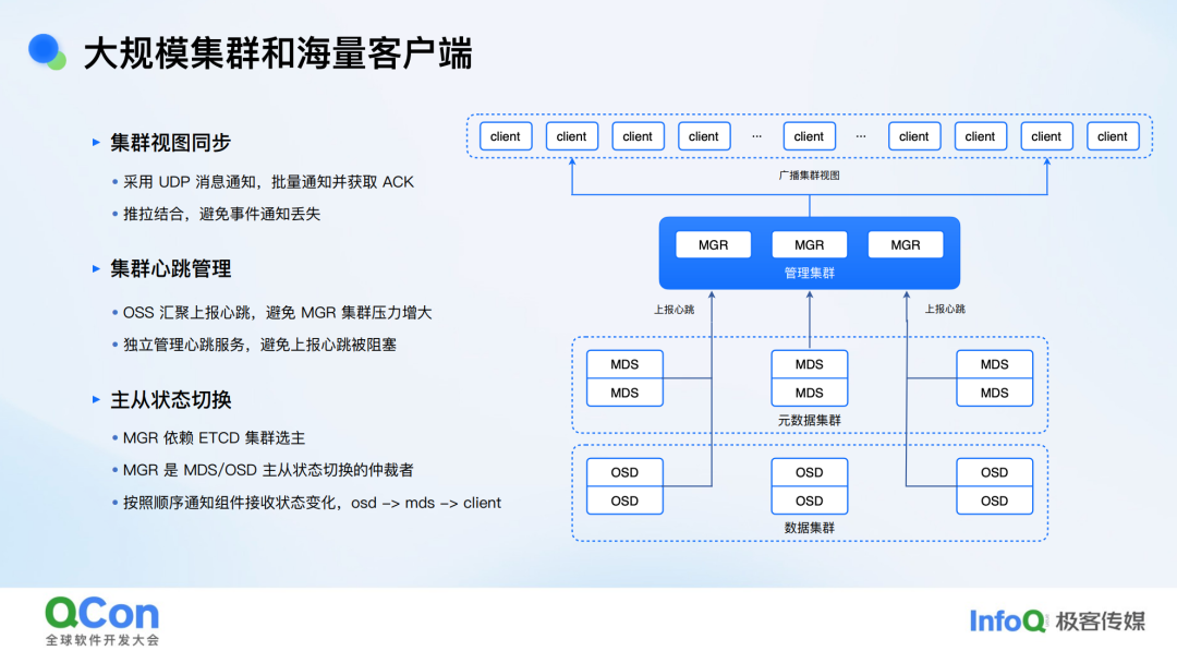 针对 AI 场景中的存储需求,我们进行了深入研究和优化。通常情况下,AI 存储集群的规模可能在几百台服务器左右,而客户端数量可能在几千台左右,这已经是一个相当大规模的集群了。在这样的集群环境中,我们开展了一系列工作,这些工作具有一定的借鉴意义。