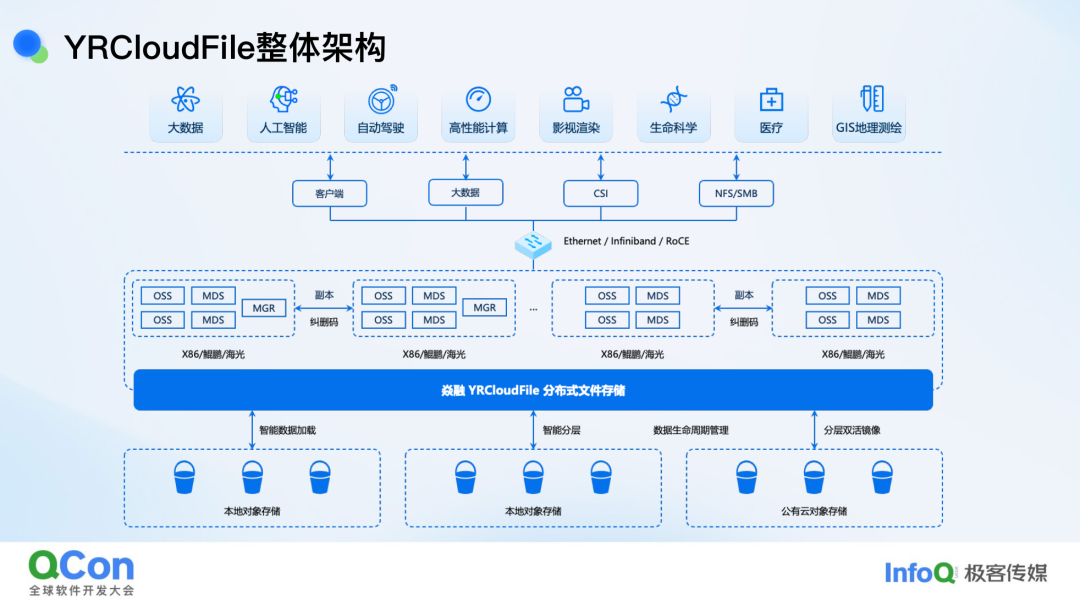 下图是 YRCloudFile 的整体架构。在最上层是协议层,我们提供了多种协议支持,包括 POSIX 私有客户端、大数据接口、CSI、NFS 以及 SMB 等。中间部分是我们的后端存储服务,每个组件都采用了高可用架构,确保了整个系统的稳定性和可靠性。在最底层,我们提供了数据生命周期管理的解决方案,包括智能数据加载和智能数据分层等功能。这些功能共同构成了 YRCloudFile 的完整架构,使其能够满足不同用户在不同场景下的多样化存储需求。