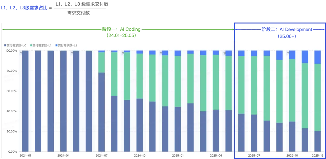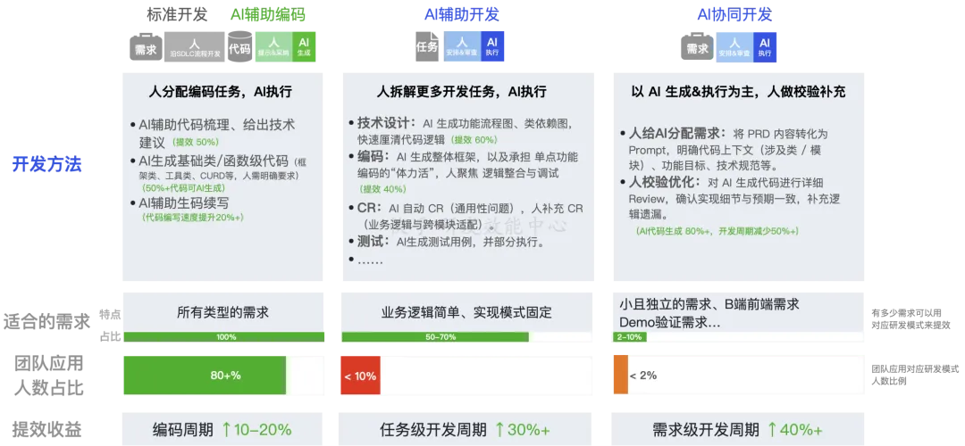 阶段 3:智能化 2.0(2025 年 7 月 +) :从“推广 AI 工具,让开发者使用”回归到了更本质的元问题:如何用 AI 提升需求端到端交付效率?经过半年多的探索,终于找到了新的路径,并得到了充分的数据验证。我们称这套解决方案为“AI 研发范式”,主要解决了 3 个问题: