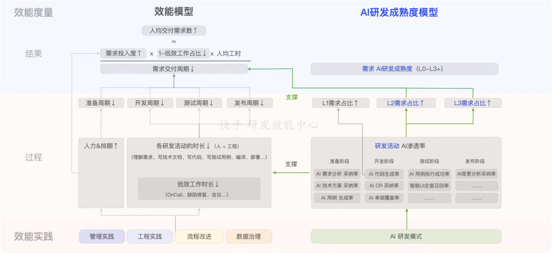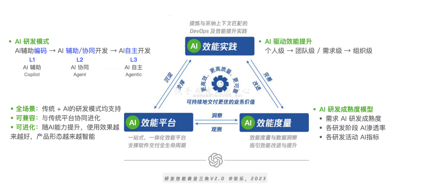 如下图所示,我们基于张乐老师的“研发效能黄金三角”框架之上做了升级,能更清晰的表达出快手的实践框架: