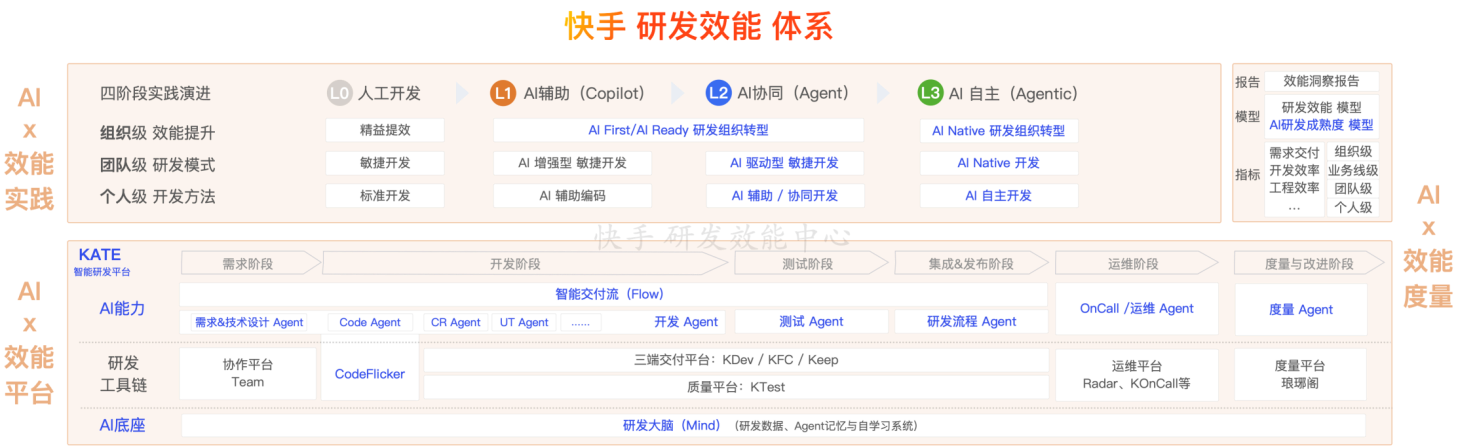当然,快手的 AI 研发范式升级仍在沿着这条路径演进中:L1 AI 辅助(Copilot)→ L2 AI 协同(Agent)→ L3 AI 自主(Agentic)。目前,我们的研发效能体系已经初步完成 AI 化升级,全景图如下图所示: