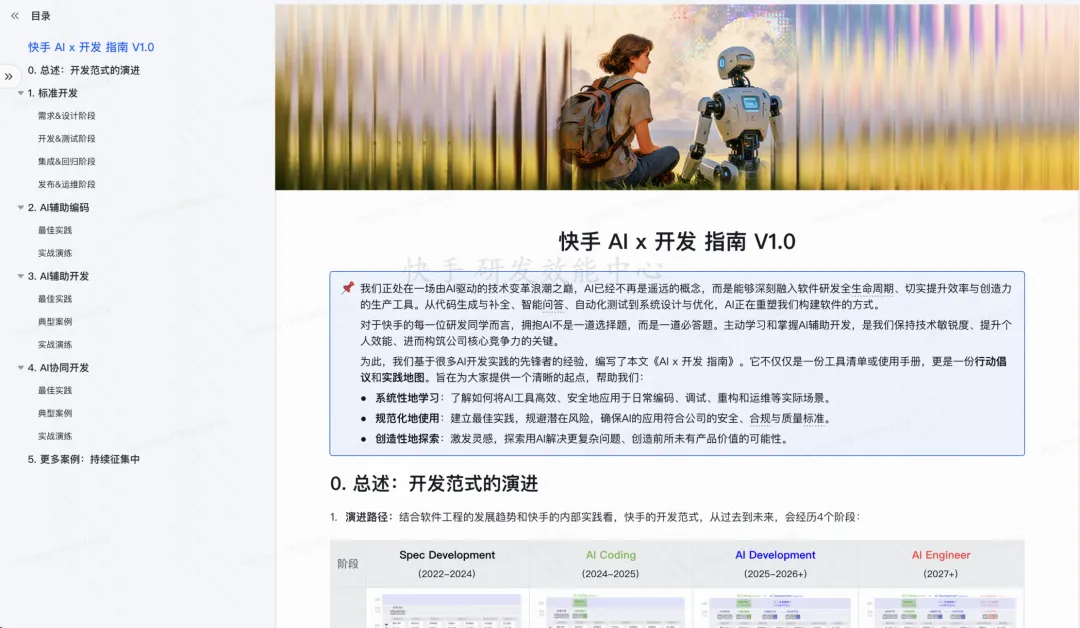 今天,快手发布了名为《快手万人组织 AI 研发范式 跃迁之路:从平台化、数字化、精益化到智能化》的 1.6 万字长文。文章由快手研发效能委员会审稿、经内部深度复盘整理,罕见地呈现了一家超大型科技企业在 AI 时代推进组织级提效的完整图景。