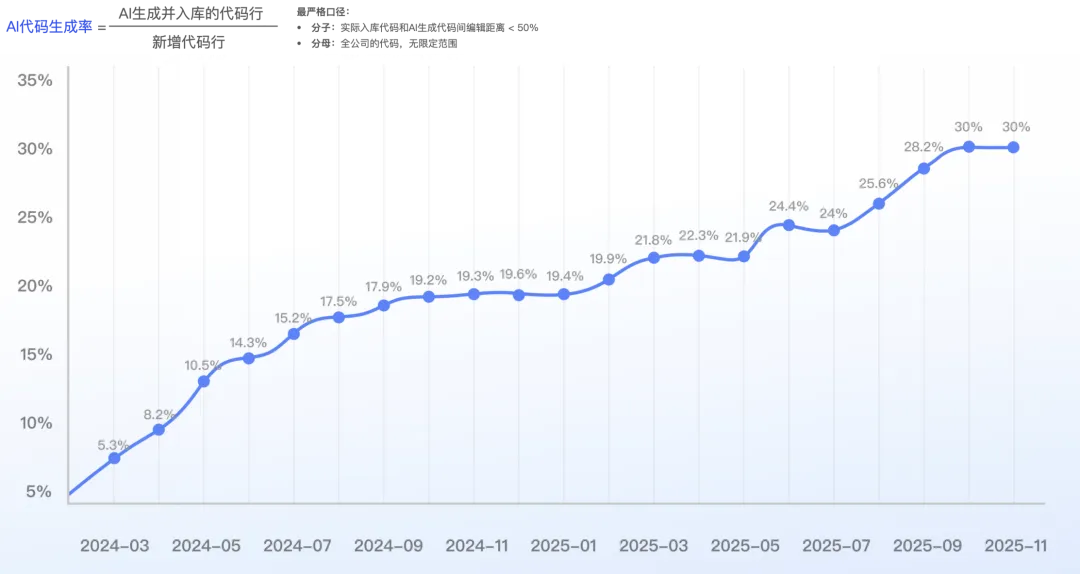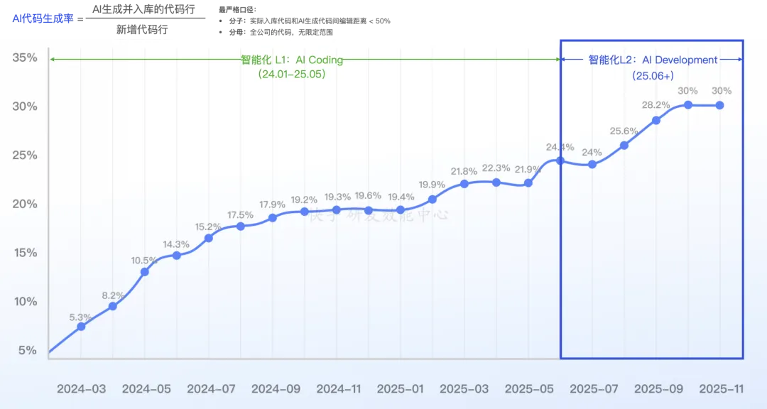 再回到全局视角,从数据上看,如果只看“AI 代码生成率”指标,可以明显看到 2025 年 6-11 月出现了一个大幅提升。实际上,在智能化 1.0 阶段,这个指标达到 24%+ 基本已经是极限了,当我们开始实施智能化 2.0 后,才开始进一步拉升。