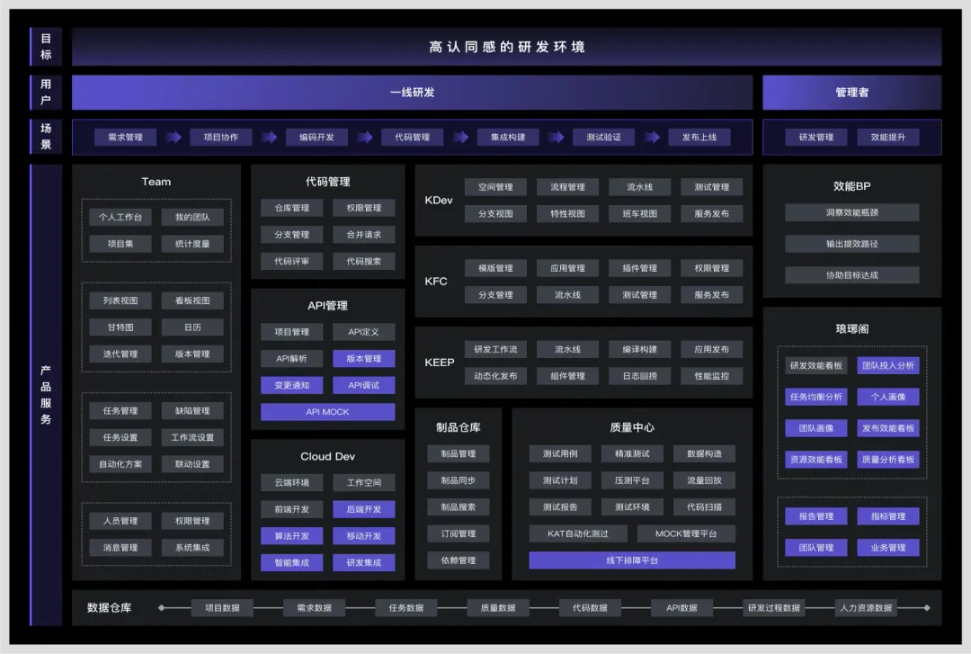 效能平台 :项目管理平台(Team)、三端一站式研发平台(KDev(服务端)、KFC(前端)、Keep(客户端))、琅琊阁(效能度量)、质量平台(KTest 等)