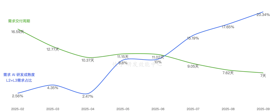 下图是最先完成 AI 范式转型团队的数据变化,可以看到 L2&L3 级需求占比达到 20.34%,需求交付周期下降 58%,2 个指标呈现明显的正相关性。
