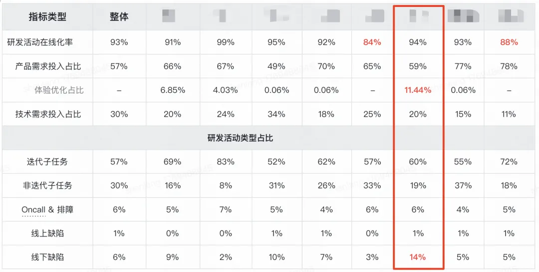 横向来看,这个团队的研发活动在线化率处于中上水平,但产品需求投入占比只有 59%,处于末尾水平。而且产品需求中体验优化占比 11.44%,又是各团队中最高的。那么问题来了,“时间都去哪儿了?”