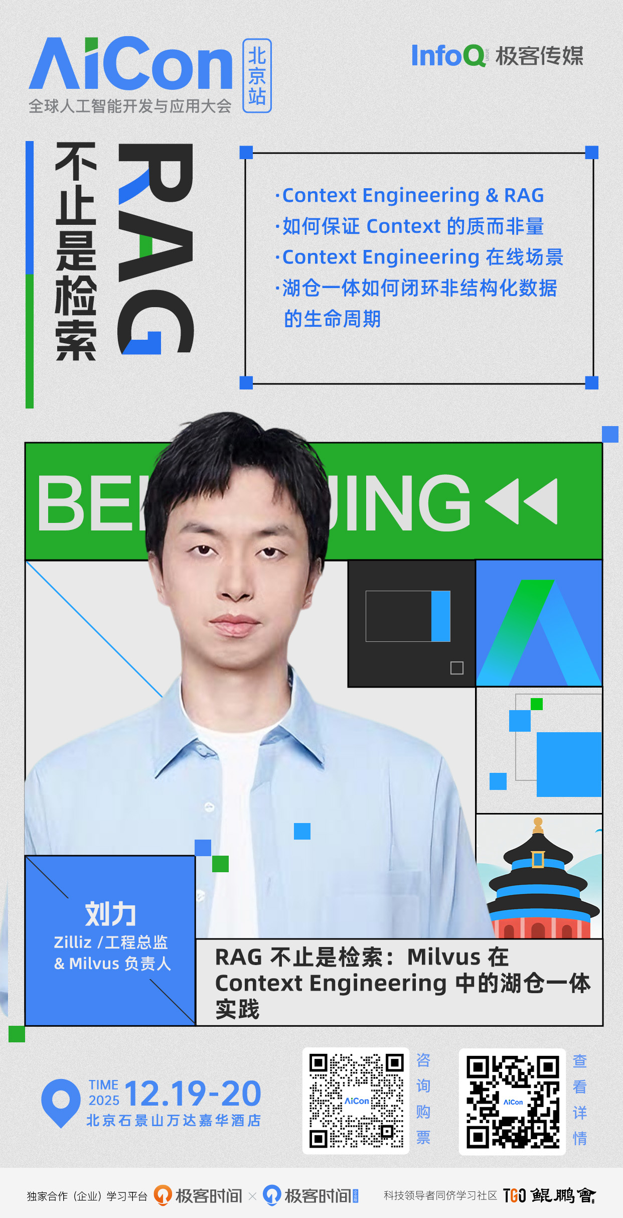 Zilliz 工程总监 & Milvus 负责人刘力已确认出席并将在「Context Engineering」专题发表题为《RAG 不止是检索:Milvus 在 Context Engineering 中的湖仓一体实践》的主题分享。Informational Context 是 Context Engineering 中至关重要的一环,而其核心挑战不在于"多",而在于"准"。为了解决 long context 带来的高成本、低性能和差效果问题,RAG 成为了最不可或缺的技术手段。随着 Context Engineering 场景大规模落地,RAG 也在快速演进。
