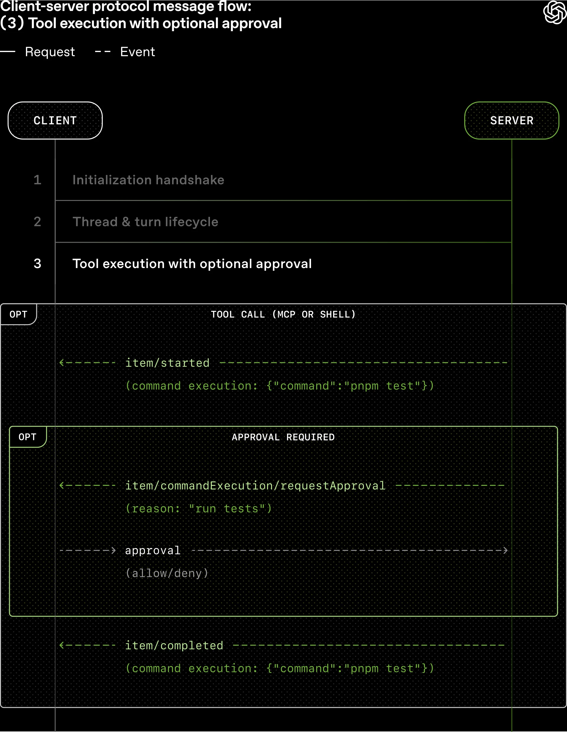 带有可选批准的工具执行的协议消息流。服务器暂停轮次并向客户端发送请求,客户端必须在智能体可以继续之前用“允许”或“拒绝”响应(来源)。