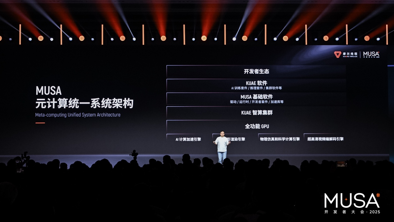 MUSA(Meta-computing Unified System Architecture)是摩尔线程自主研发的元计算统一计算架构,也是国内首个在单芯片上同时支持 AI 智算、图形加速、科学计算、物理仿真以及超高清视频编解码的全功能 GPU 架构,并覆盖从芯片架构、指令集、编程模型到软件运行库及驱动程序框架等的全栈技术体系。