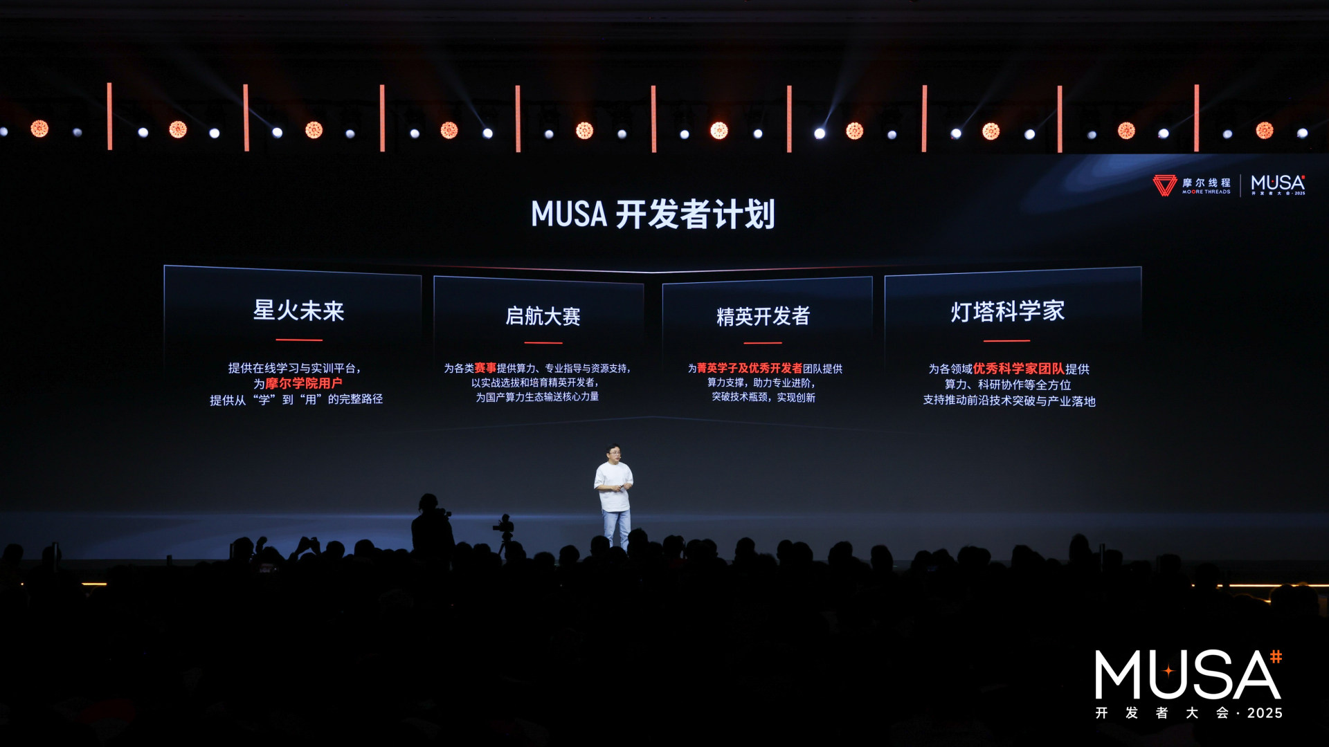 此外,摩尔线程正在加速建设 MUSA 生态中心,首个 MUSA 生态中心将落地北京海淀区。作为整个 MUSA 生态的核心运营基地与公共服务平台,MUSA 生态中心将为所有开发者提供核心技术支撑、展示成果和交流创新、人才培养与创新孵化等多重职能。摩尔线程同时发布了 MUSA 开发者计划,面向从 AI 学习探索到科研创新的各类开发者提供算力和技术支持,确保每个参与者都能在生态中找到成长通道。