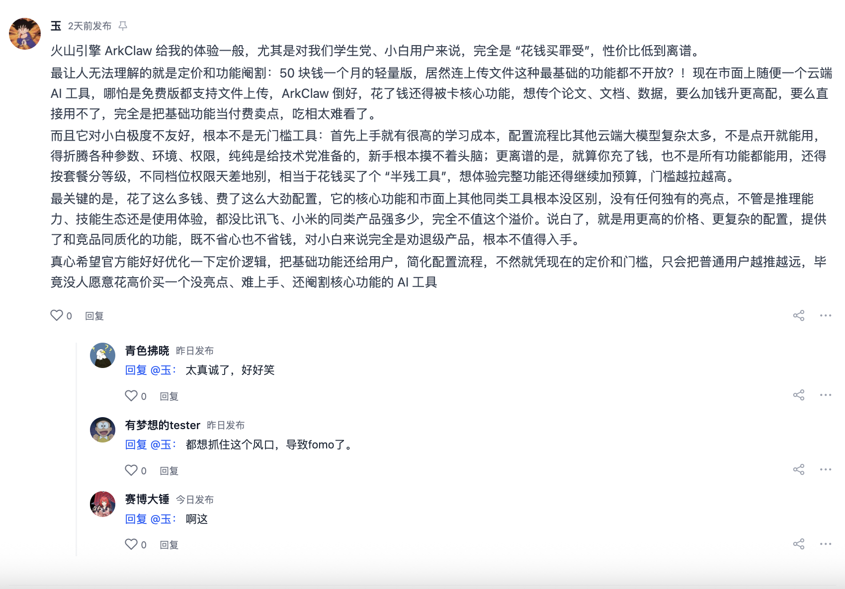 整体更偏企业协作、SaaS 化。但用户反馈也比较两极,有人吐槽道,ArkClaw 性价比低、功能阉割严重且配置复杂,核心功能与竞品同质化而无亮点,价格与服务不匹配,建议官方调整定价逻辑并降低使用门槛。