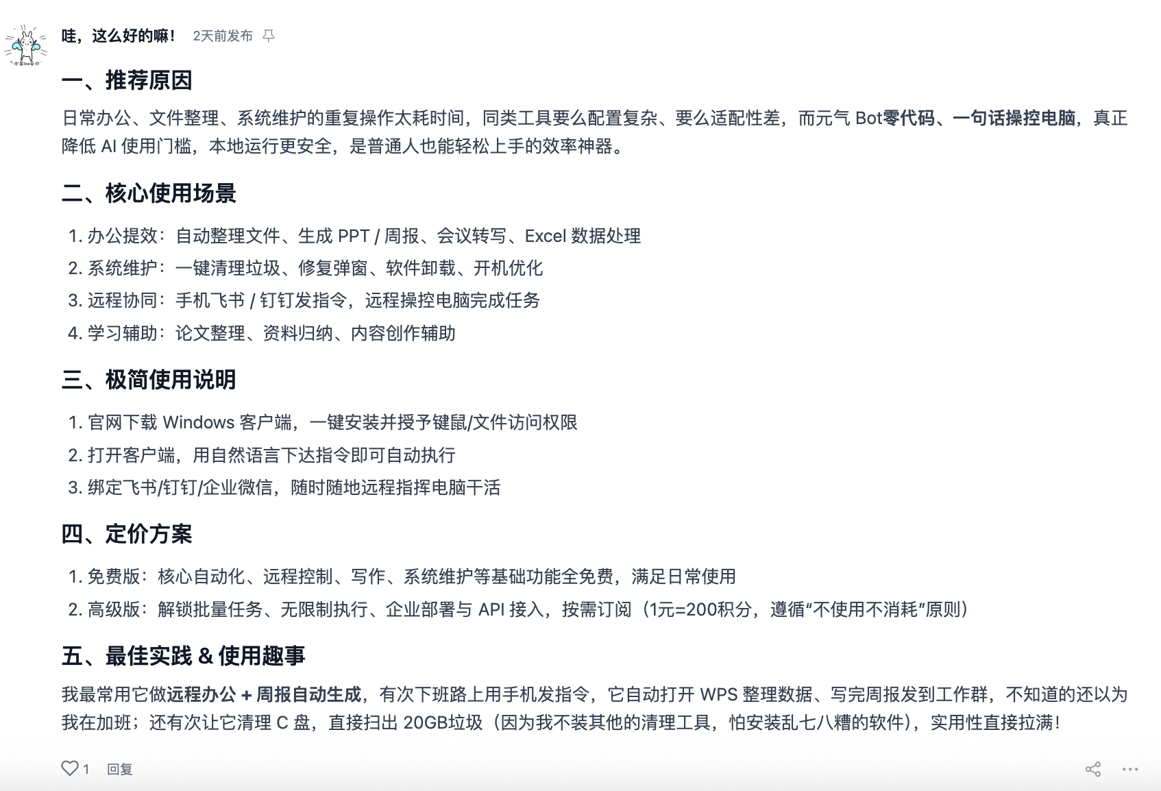 不过要注意一点:元气 Bot 目前主要跑在 Windows 上,核心能力依赖本地系统权限。