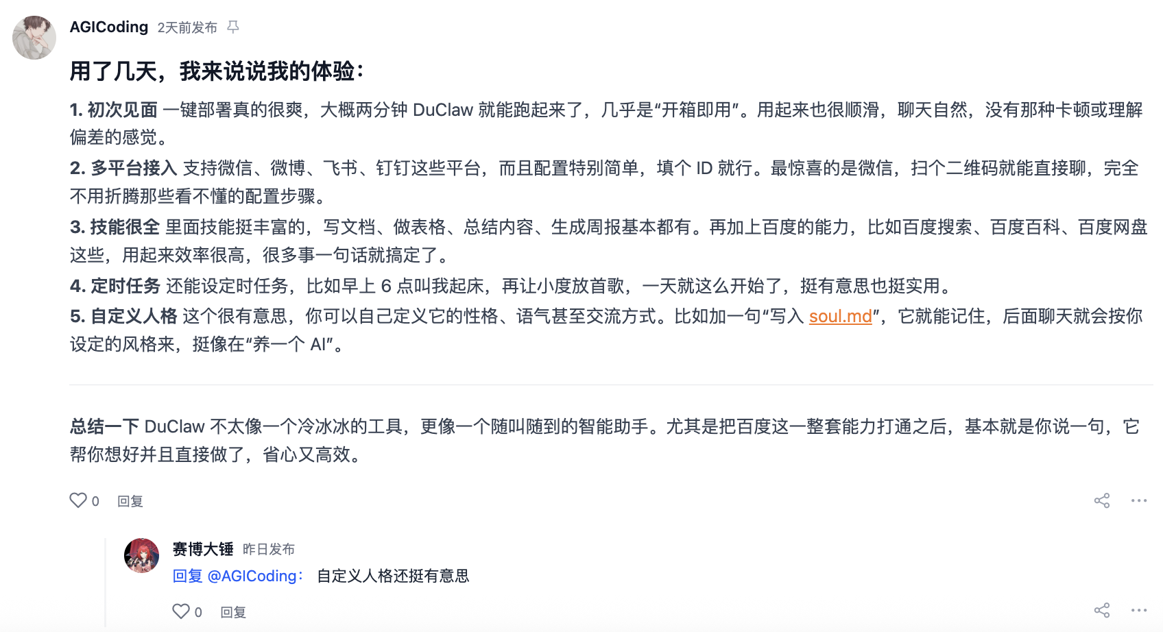 DuClaw 的特点,是把百度整套能力“打包进一个 Agent”里——搜索、百科、网盘等能力打通后,它更像一个能自己查、自己整理、再把结果交付出来的执行助手。