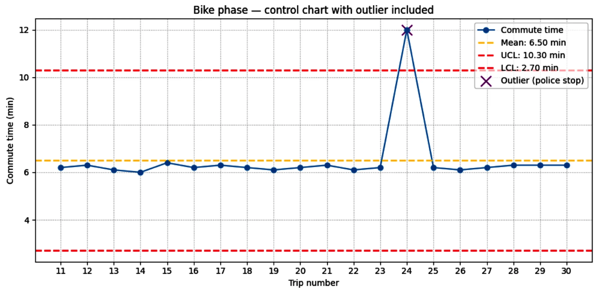 除了发现特殊原因外,PBC 还有助于检测变化,即整个系统移动到新的性能水平的时刻。在上面的通勤示例中,这些变化出现在每次引入真正的改进时,如购买自行车或找到更短的路线,这些变化就会表现为平均通勤时间的明显下降。从技术上讲,当几个连续的点落在之前的均值之上或之下时,就会发生变化,表明过程已经发生了根本改变。与一次性的特殊原因不同,变化表明了一个新的“常态”,通常是由自动化或工作流程变化等刻意改进引起的。