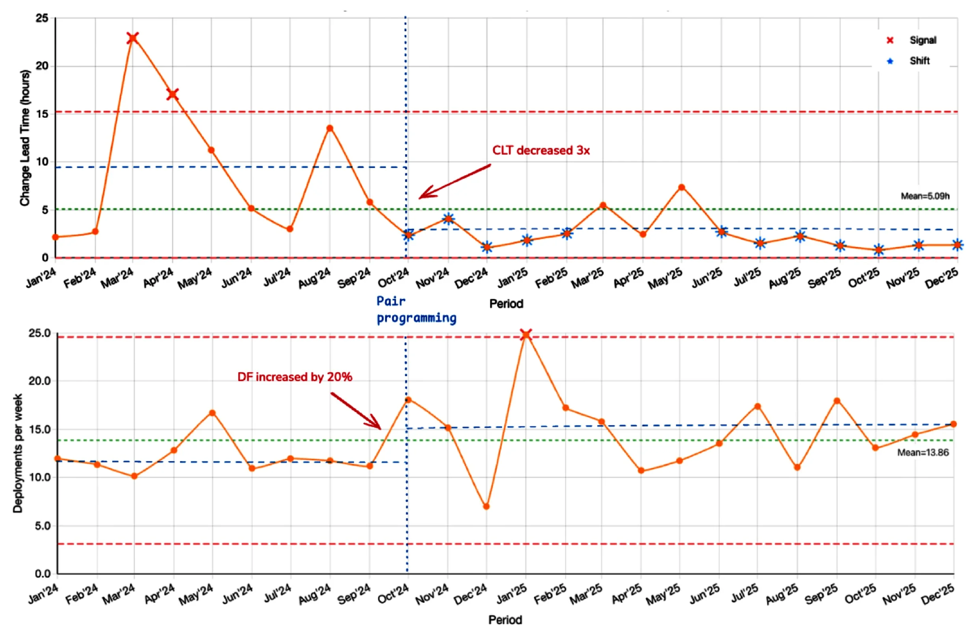 图 5 一个团队的部署频率和变更前置时间的过程行为图。上面的图表显示了自引入结对编程以来,检测到的向更高性能水平的转变。下面的图表显示,吞吐量不仅没有降低,甚至有所提高。