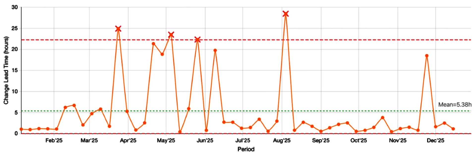 想象一下,一个团队注意到在 2025 年 2 月中旬,CLT(变更前置时间)上升(见下图)。