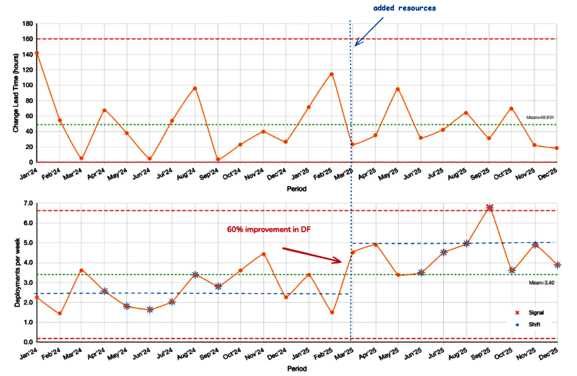 图 6 一个团队的部署频率和变更前置时间的过程行为图。上面的图表显示,在增加额外资源后检测到吞吐量变化了 60%。