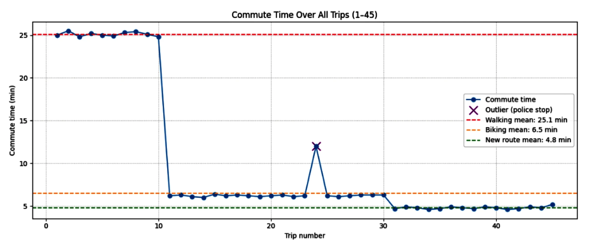 图 1 每个平坦的部分,或高峰,代表一个稳定的过程(步行、骑车、新路线)。真正的改进表现为清晰的、突然的下降到一个新的、更快的水平。