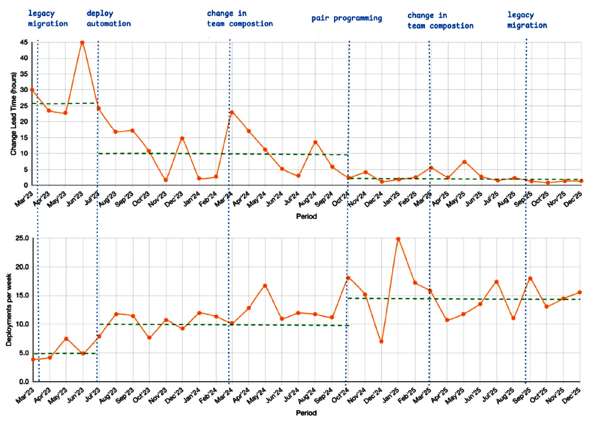 在三年内,CLT 改善了大约十倍,DF 提高了三倍。这种改进是由内部优化驱动的。还能更好吗?可能。更早地采用结对编程可能会更快地获得这些收益。