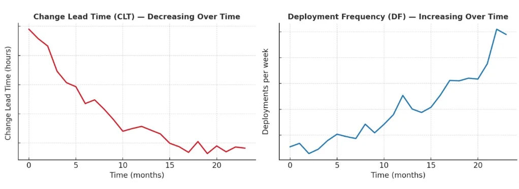 CLT ≈ 10 小时,DF ≈ 每周 10 次(引入部署自动化)。