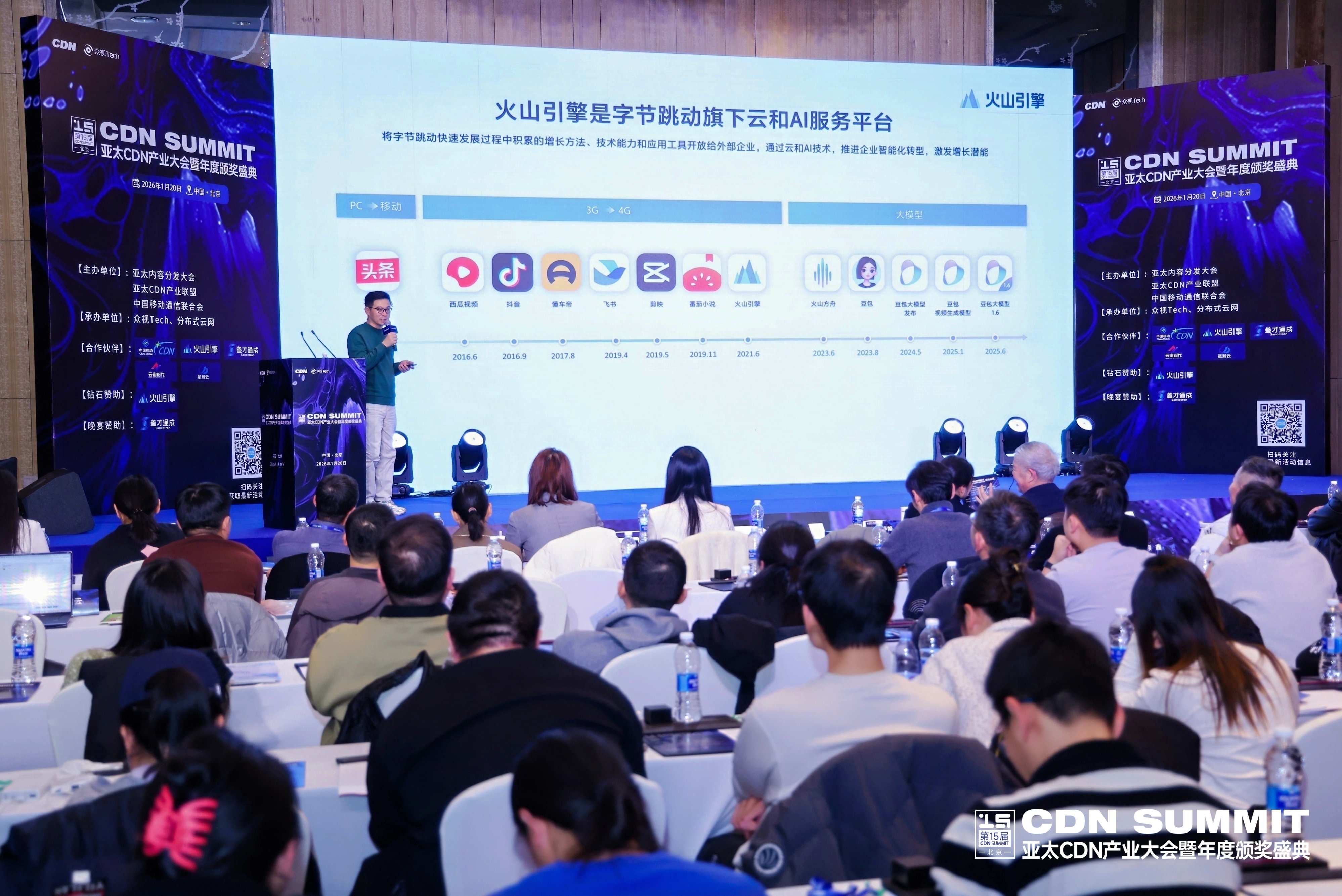 2026 年 1 月 20 日,第十五届亚太 CDN 产业大会暨年度颁奖盛典在北京隆重举行。作为 CDN 领域极具影响力的行业盛会,大会汇聚产、学、研、用领域领袖与专家,聚焦数智新时代下内容分发网络的技术创新与产业变革。火山引擎视频云边缘产品线高级解决方案总监许思安受邀出席,发表《AI 时代下应用加速的演进》主题演讲,深度解析火山引擎边缘云核心能力、AI 大模型融合场景及 CDN 未来演进形态,凭借扎实的技术沉淀与前瞻视野引发全场关注。
