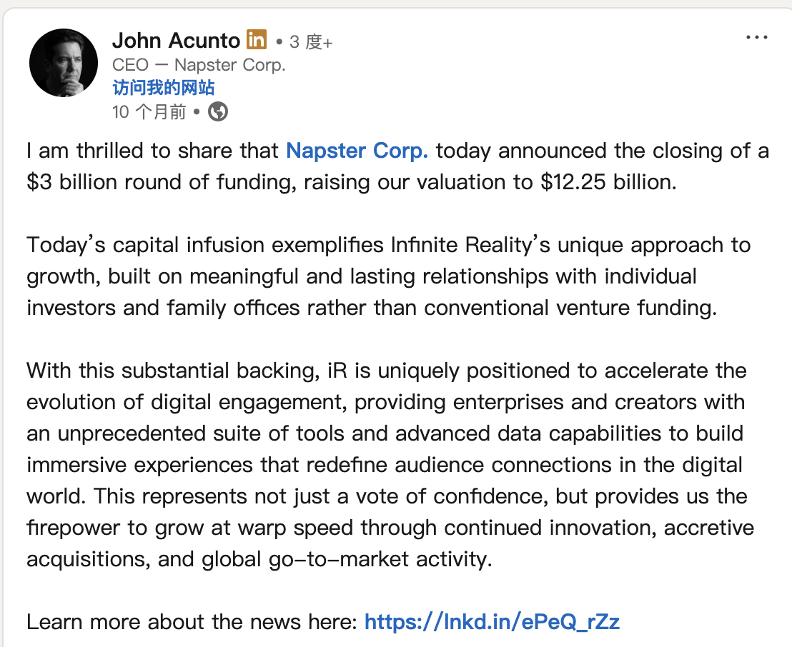 Napster CEO Acunto 在会上公开表示,公司此前声称已在今年 1 月获得的一笔 33.6 亿美元、估值 120 亿美元的大额投资——很可能永远不会到账。