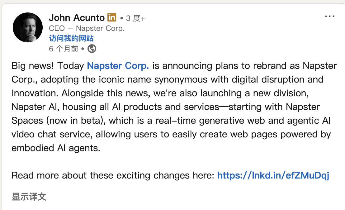 今年 5 月,Infinite Reality 向内部股东 (约 1500 人) 宣布,将公司更名为 Napster Corporation,以统一其技术平台与音乐品牌。Napster 是 1990 年代末标志性音乐共享服务品牌,后因版权诉讼倒闭,近年被多次转售。