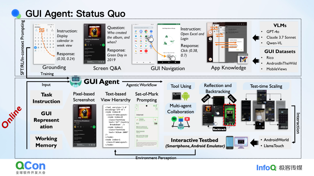 模型训好后,就进入在线 Agent 构建阶段,跟 Deep Research 或 Coding Agent 类似:搭 memory、拼上下文、选工具、定制 test-time 调度策略。做完再放到 Testbed 跑分。GUI Agent 的麻烦在于 Testbed 本身就不完善,不像 ImageNet 那样“是猫还是狗”一目了然。GUI 任务的路径几乎无限,界面又随时可能弹出广告,评判难度高,所以 Testbed 至今仍是研究热点。