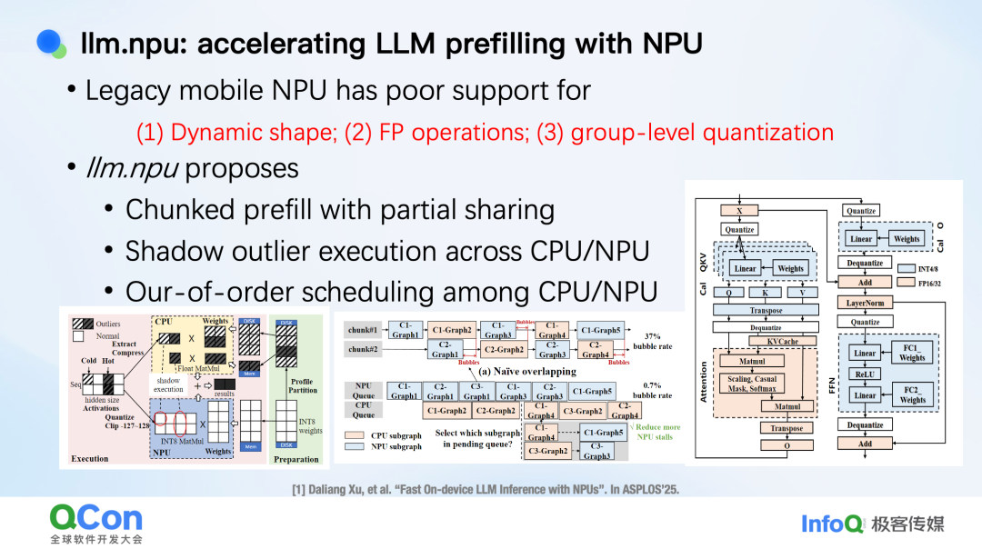 实际上,真跑起来就会发现一堆不兼容:动态 shape 不支持;很多 NPU 缺乏足够的 FP 算力,可我们当时的量化算法里,attention 里不少算子还是会溢到 FP;官方暴露的算子也不支持 group-level 量化,而大模型又必须靠 group-level 来抑制 outlier,否则精度掉得没法看。我们没法像海思那样直接改芯片,只能在一块“成品”硬件上,用算法和系统手段去填大模型语义和 NPU 能力之间的沟。当时提的 chunked prefill 之类的小技巧,现在看已经挺常见,高通内部的 Gini 框架也在用类似思路。