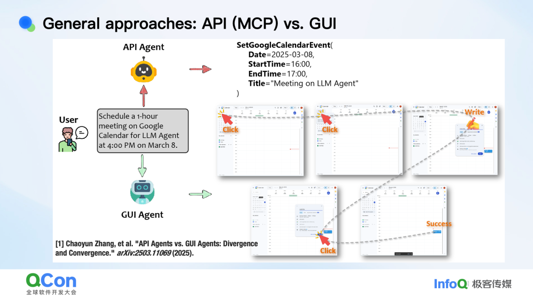 在 Agent 方面,我们做了一些初步尝试。Agent 有两条路线:API 与 GUI,未来肯定是混合的。从研究角度看,GUI Agent 更值得做,因为 API Agent 更多依赖工业界生态,而 GUI agent 距离 C 端商业化还很远,远没到能提供 99% 以上准确率的地步。