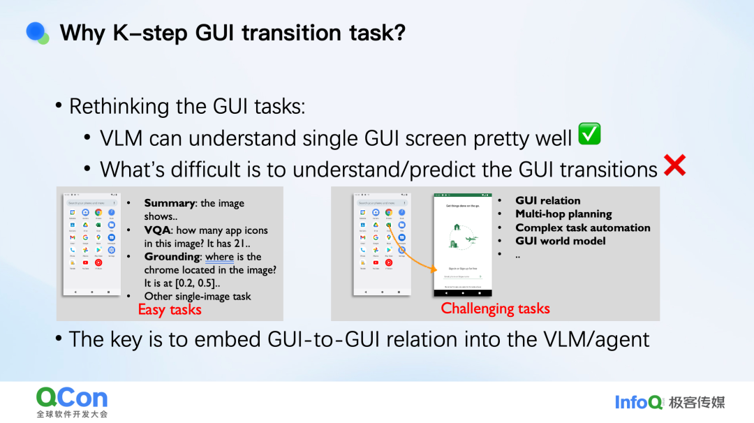 我们重新梳理 GUI 任务后发现,当前 VLM 对单张界面图的理解已经很强:把手机截屏丢给 GPT 或豆包,做 VQA 或 Grounding 都能答得不错。真正的难点在于“跨页关联”,给出当前界面,执行某个动作后,下一界面会变成什么样。这种能力在长程 GUI 任务里尤为关键,却几乎没出现在 VLM 的预训练目标中。它很像机器人里的世界模型:给定状态与动作,预测下一状态。事实上,数字 Agent 与实体 Agent 在能力需求上越来越重叠,比如如何利用无标注数据、如何构建世界模型,这些问题是相通的。