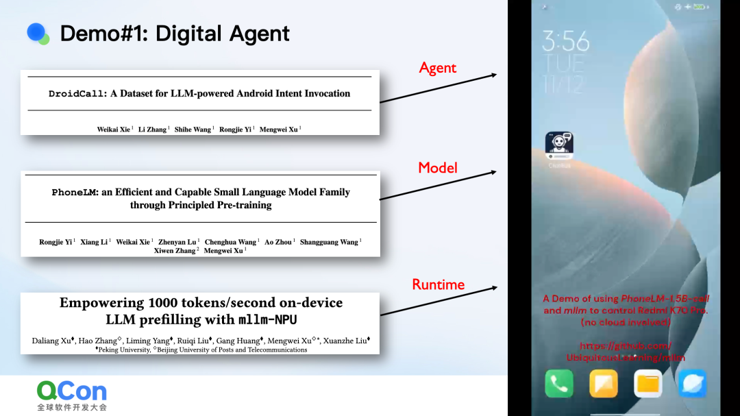 先讲应用。过去做端侧 AI,业界常做的是 TTS 这类任务,我们则把重点放在机器学习模型的压缩与加速上。但这类工作本质上是优化一个独立任务,而非端到端的应用,所以可玩性有限——不同应用需要不同的优化策略。到了大模型时代,出现了一个非常集中的“杀手级”应用:小爱、小艺、Siri 这类助手。它们背后几乎都由 LLM 或 VLM 驱动,这就给学术界提供了一个可以长期聚焦、深入研究的明确方向。