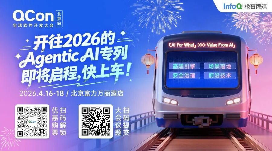 QCon 北京 2026 已正式启动,本届大会以“Agentic AI 时代的软件工程重塑”为核心主线,推动技术探索从「AI For What」真正落地到可持续的「Value From AI」。从前沿技术雷达、架构设计与数据底座、效能与成本、产品与交互、可信落地、研发组织进化六大维度,系统性展开深度探索。开往 2026 的 Agentic AI 专列即将启程!汇聚顶尖专家实战分享,把 AI 能力一次夯到位!